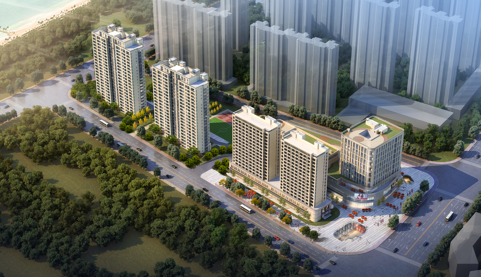 合理的功能分區(qū),沿城市主干道打造社區(qū)服務(wù)配套設(shè)施,服務(wù)小區(qū)及周邊居民,住宅建筑在融合城市肌理的情況下,最大限度遠離北側(cè)已建的住宅區(qū),減少對北側(cè)已有住宅的遮擋及影響。本項目充分利用地下公交首末站,采用了類地鐵上蓋的商業(yè)模式。