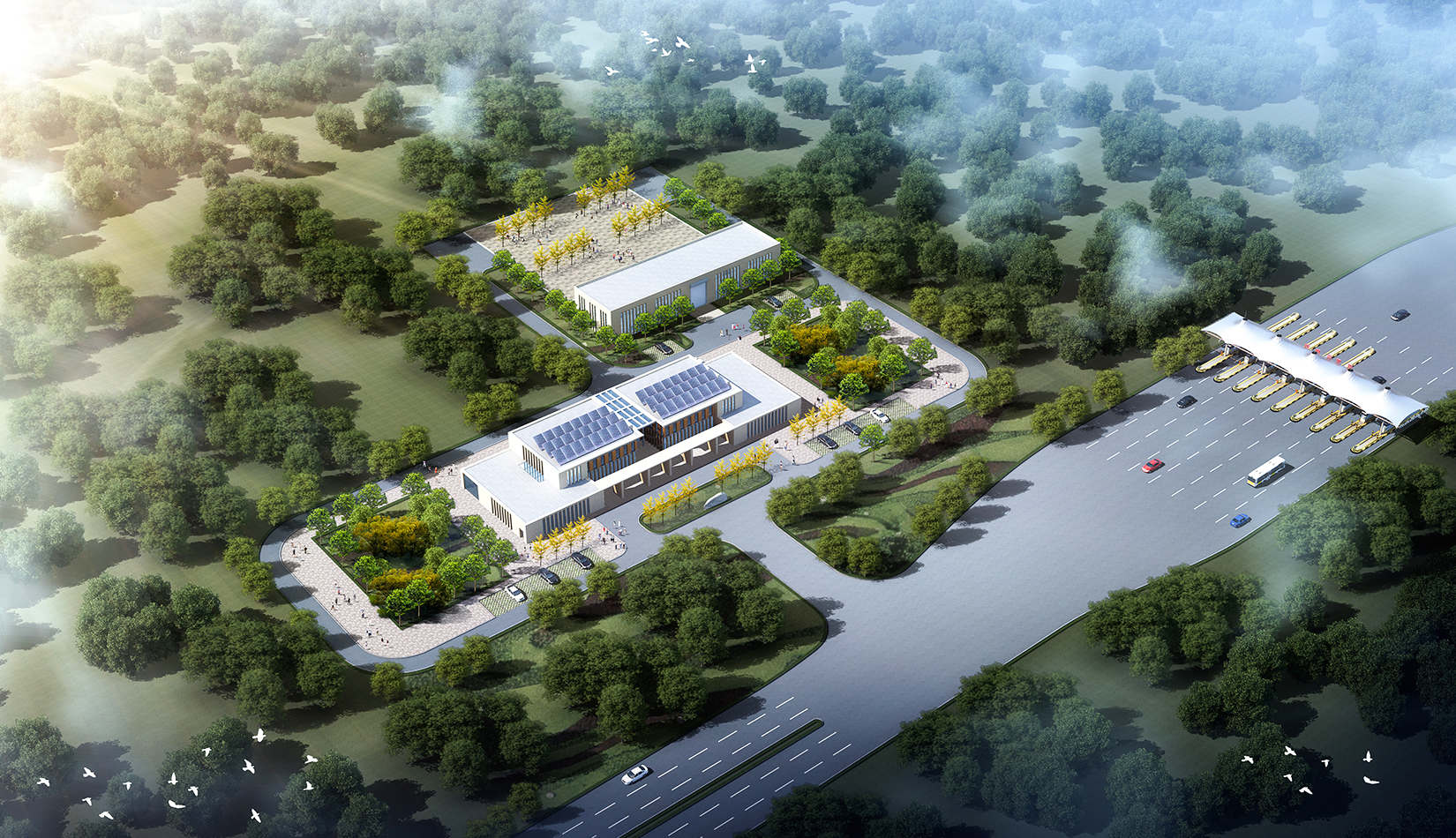新機(jī)場(chǎng)高速公路是膠東國(guó)際機(jī)場(chǎng)集疏運(yùn)系統(tǒng)的重要組成部分,是連接我市主城區(qū)的迎賓大道。主線收費(fèi)廣場(chǎng)作為青島的門戶,旅客來(lái)青的第一印象,方案設(shè)計(jì)充分體現(xiàn)青島城市特征,建筑形式與新機(jī)場(chǎng)航站樓“海星”造型相互呼應(yīng),從“建筑風(fēng)格、視覺(jué)傳達(dá)、空間感受”三個(gè)方面完善方案設(shè)計(jì),遵從生態(tài)環(huán)保原則,實(shí)現(xiàn)收費(fèi)雨蓬、站房、生態(tài)環(huán)境協(xié)調(diào)統(tǒng)一,結(jié)合地域特色與地產(chǎn)描畫,展現(xiàn)城市海洋文化。