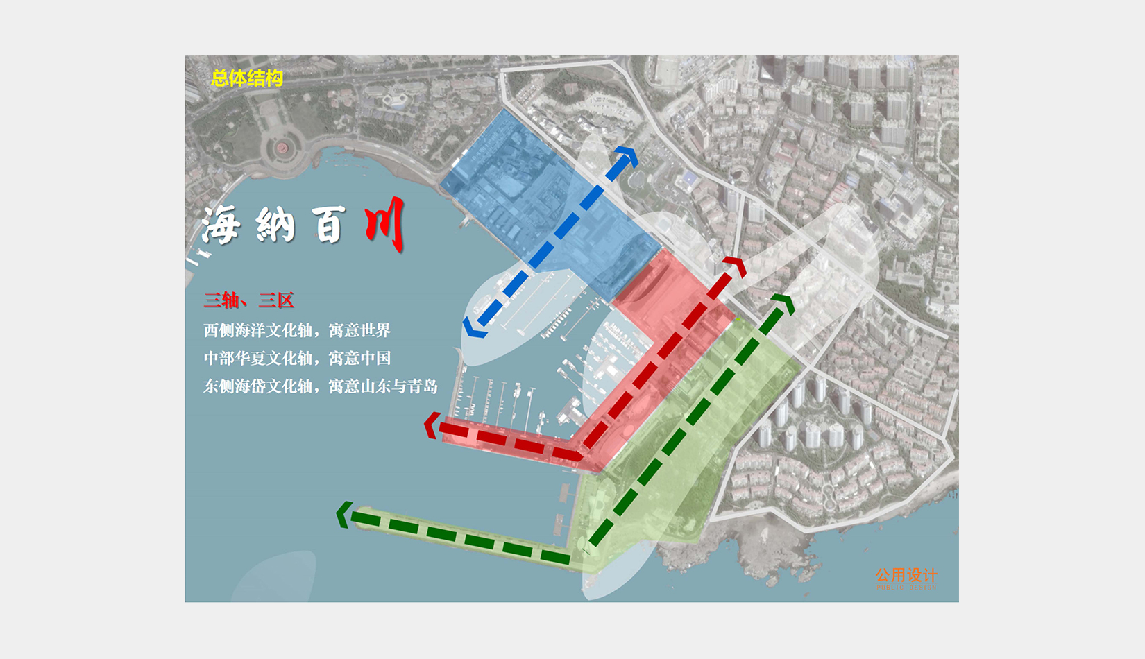總體規(guī)劃以“青島與世界對話,合作與發(fā)展共贏”為核心理念,“海納百川、帆揚(yáng)世界”為主題定位,形成了三軸、三區(qū)的“川”字型整體規(guī)劃結(jié)構(gòu)。