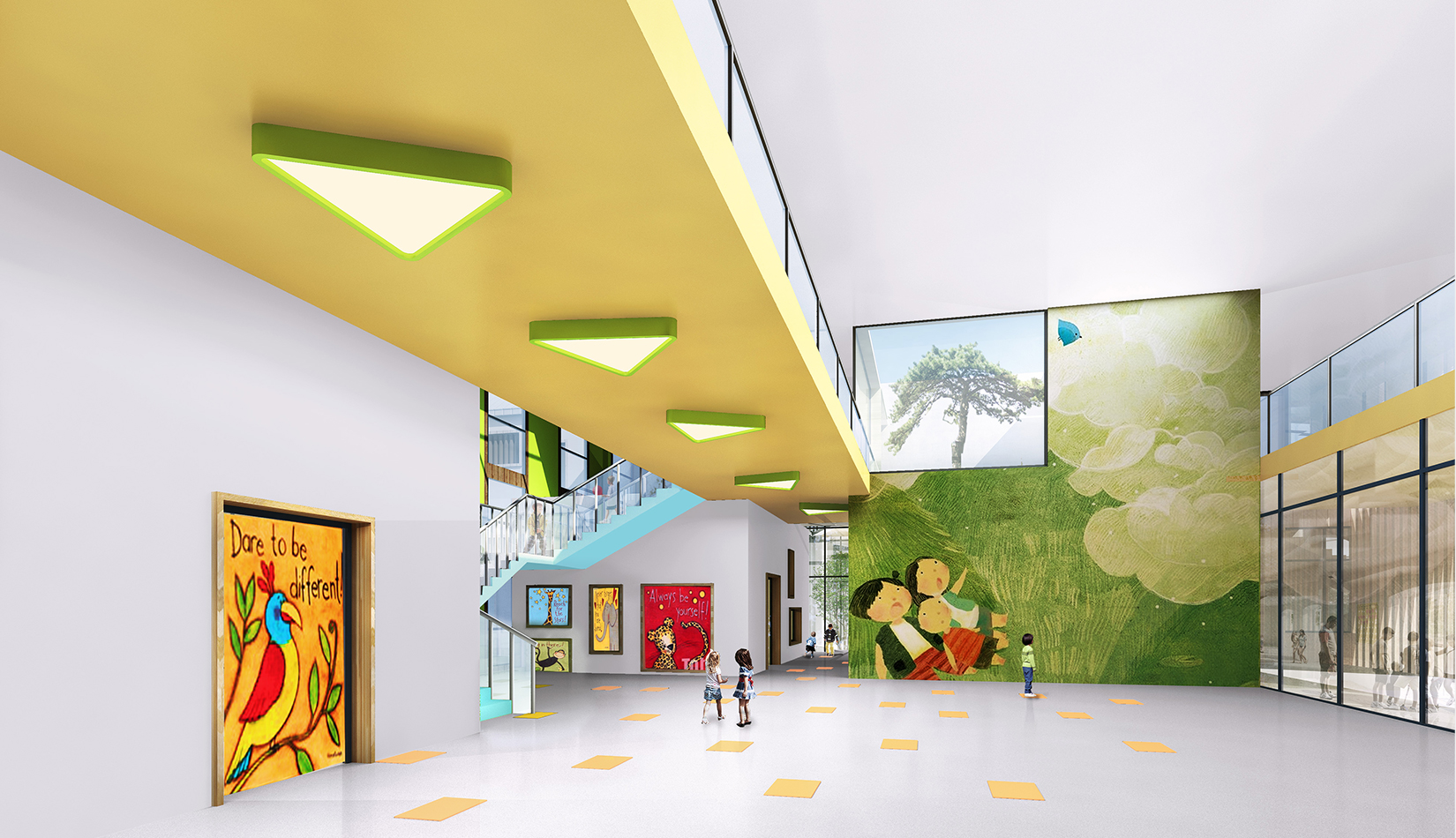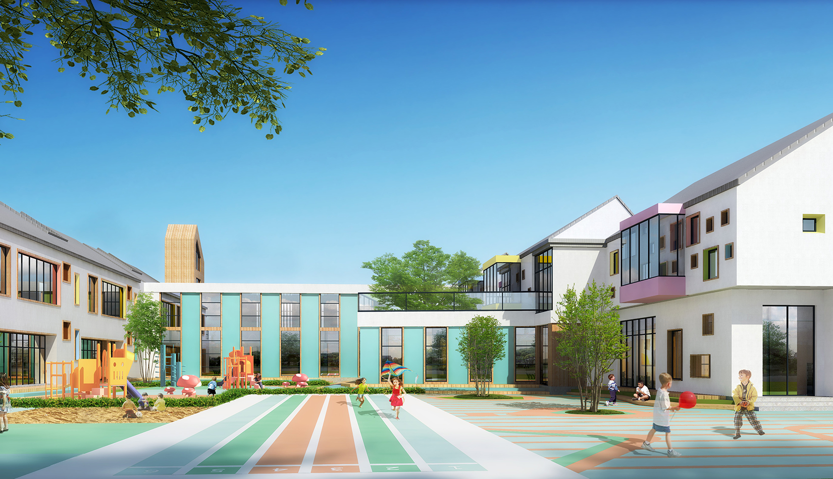 建筑造型來源于兒童最初對房子的印象并進行延伸,加上積木搭接形態(tài),形成C字形圍合的主體建筑,就像父母溫暖的懷抱;建筑造型跟兒童產(chǎn)生很好的親切感,讓兒童將上幼兒園成為快樂的事情。同時形態(tài)結合地緣文化特色,采用雙折坡屋頂,寓意展翅翱翔的海鷗。