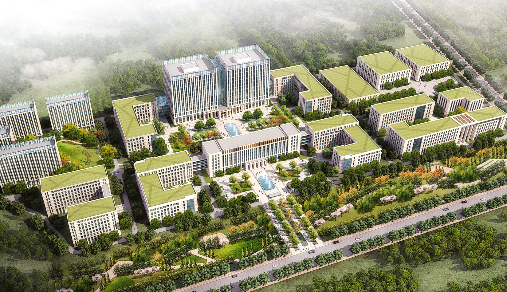 基地位于山東省青島市黃島區(qū)顧家崖頭村以東,濱海支路道路紅線以西,大學一路以北區(qū)域,占地面積10 萬平米。本著功能至上的布局原則,結合庭院方案按照功能分為五個區(qū)域:公寓區(qū)、辦公區(qū)、廠房區(qū)以。辦公區(qū)為整個園區(qū)的中心,占據(jù)基地最重要的中心地帶;公寓區(qū)位于基地西側相對比較安靜的地塊;廠房區(qū)既要有相對便捷的交通出入口,同時又不能影響整體園區(qū)的沿街立面,因此廠房區(qū)位于整個基地的東北角,這樣的一個功能分區(qū)可以有效的組織人流,使功能更加合理。