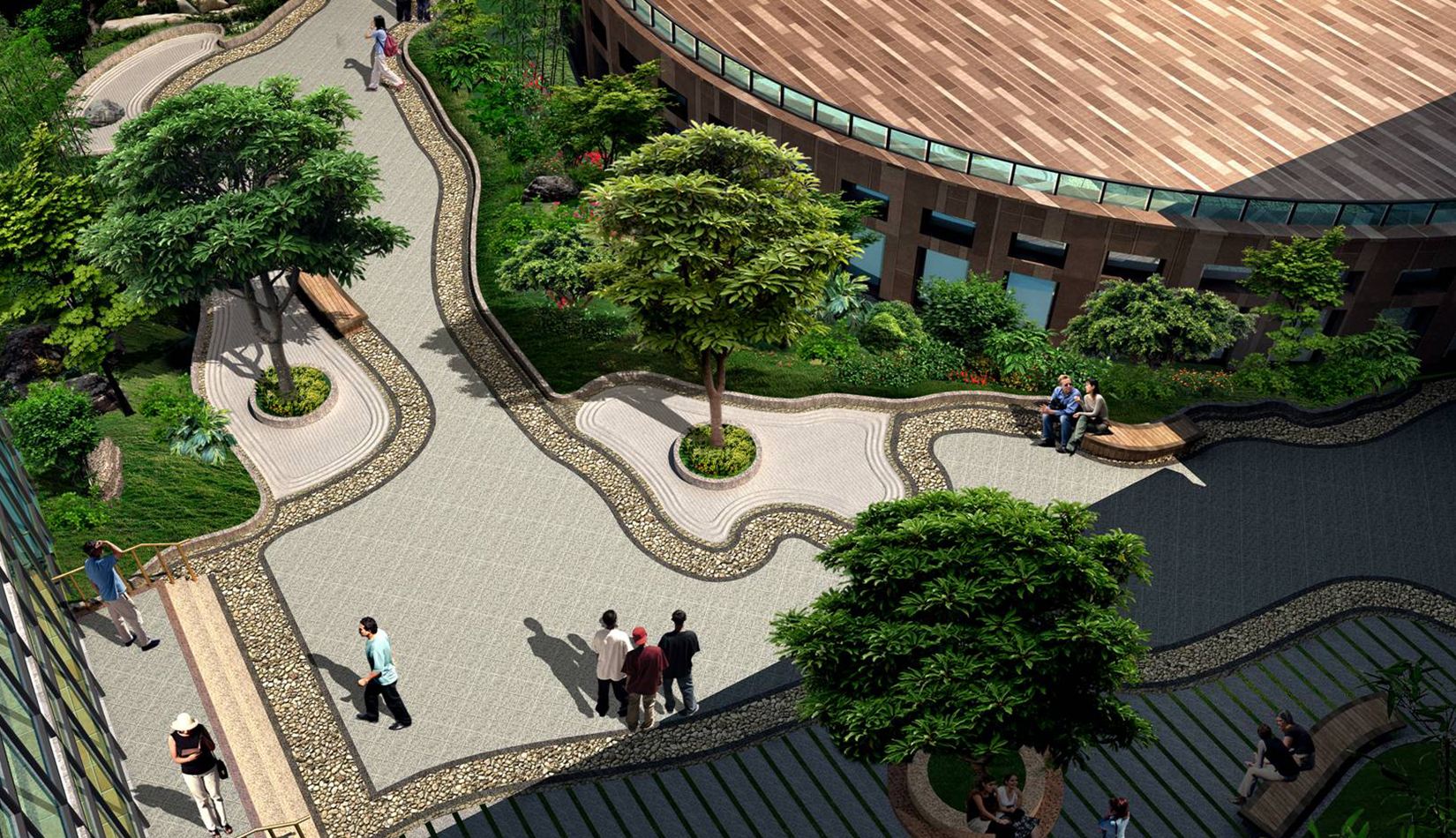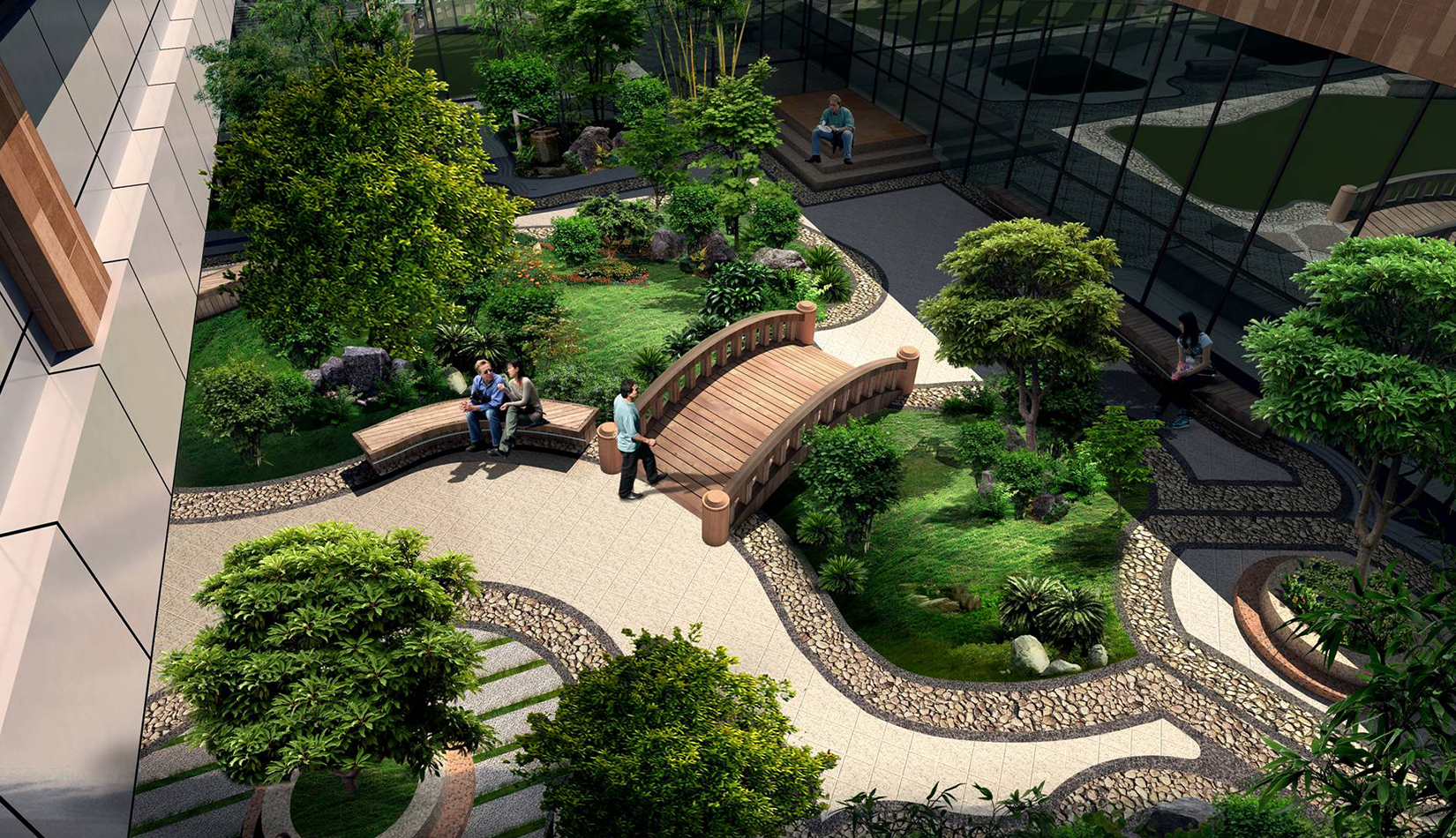 2. 綜合服務(wù)樓中心設(shè)計(jì)特色水景一處,潺潺的流水聲,增加整個(gè)入口空間的活潑歡快的氣氛。